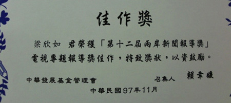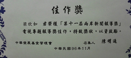 ● 2007 年獲兩岸新聞報導獎「電視專題報導獎佳作」