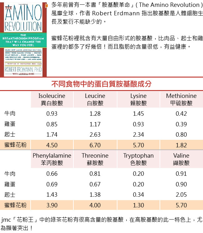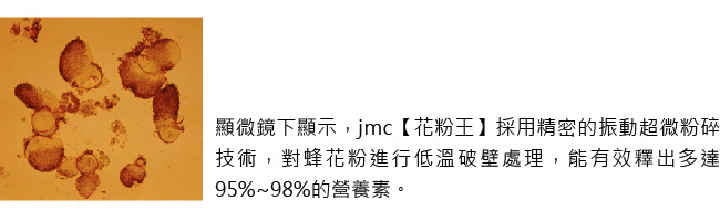 - 功效一定是很好的,因為 jmc【花粉王】以獨家配方與尖端技術進行製造,可說是蜂花粉的升級加強版,會讓您感到滿意。