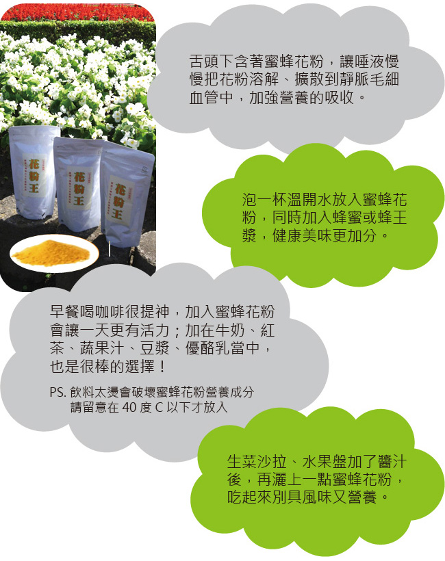 - 蜂花粉是天然的營養食品,不會有副作用。惟過敏者或特殊體質的人,仍應先請教醫生或專業醫療人員之意見為宜。