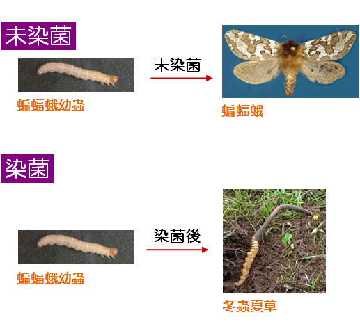 夏天時蝙蝠蛾科幼蟲爬到土壤上活動,如果被蟲草菌孢子感染的話,當幼蟲爬回土壤下過冬,真菌就會在其體內吸收營養而發展菌絲,最後充滿幼蟲體內,蟲即僵死,在此階段稱為「冬蟲」。到了夏季,真菌從死蟲的頭頂上長出菌座,露出土面,便是所謂的「夏草」。